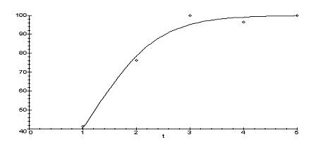Legende: a und b sind die Parameter des Modells; Der Determinationskoeffizient D = 0.9859 zeigt eine sehr gute Übereinstimmung zwischen dem Modell und den Daten an, wie auch die folgende Graphik bestätigt: