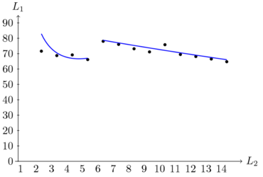 Der Bruch des Verlaufs zwischen <math>L_2 = 5</math> und <math>L_2 = 6</math> erlaubt es, den Verlauf in zwei Teilen zu erfassen. So kann für den ersten Teil <math>a = 1</math> und für den Zweiten <math>b = 0</math> gesetzt werden. Die genutzten Formeln sind somit Formel (6) für den ersten Abschnitt und für den zweiten Bereich Formel (4).