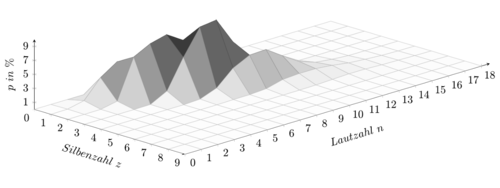 Einsilber umfassen 1-7 Laute, d.h. 7-fache Variation (das längste Einsilbenwort hat siebenmal soviel Laute wie das kürzeste). Zweisilber umfassen 2 - 10 Laute (5-fache Variation), Dreisilber 4 - 14 Laute (3,5-fache Variation), Viersilber 6 - 16 Laute (2,7-fache Variation), Fünfsilber 7 - 17 Laute (2,4-fache Variation), Sechssilber 10 - 20 Laute (2-fache Variation, d.h. der längste Sechssilber hat nur doppelt soviele Laute wie der kürzeste), Siebensilber 13 - 21 (1,6-fache Variation), Achtsilber 16 - 21 (1,3-fache Variation) und Neunsilber umfassen 18 - 22 Laute, d.h. nur 1,2-fache Variation.