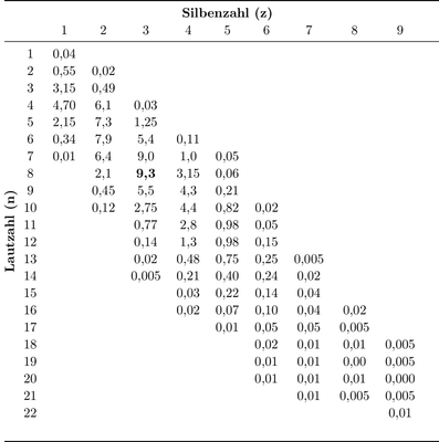 Einsilber umfassen 1-7 Laute, d.h. 7-fache Variation (das längste Einsilbenwort hat siebenmal soviel Laute wie das kürzeste). Zweisilber umfassen 2 - 10 Laute (5-fache Variation), Dreisilber 4 - 14 Laute (3,5-fache Variation), Viersilber 6 - 16 Laute (2,7-fache Variation), Fünfsilber 7 - 17 Laute (2,4-fache Variation), Sechssilber 10 - 20 Laute (2-fache Variation, d.h. der längste Sechssilber hat nur doppelt soviele Laute wie der kürzeste), Siebensilber 13 - 21 (1,6-fache Variation), Achtsilber 16 - 21 (1,3-fache Variation) und Neunsilber umfassen 18 - 22 Laute, d.h. nur 1,2-fache Variation.